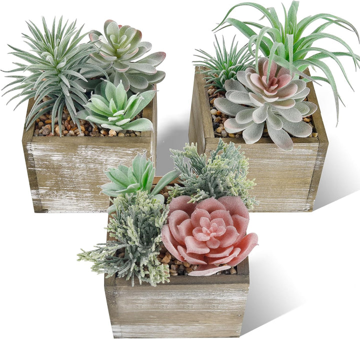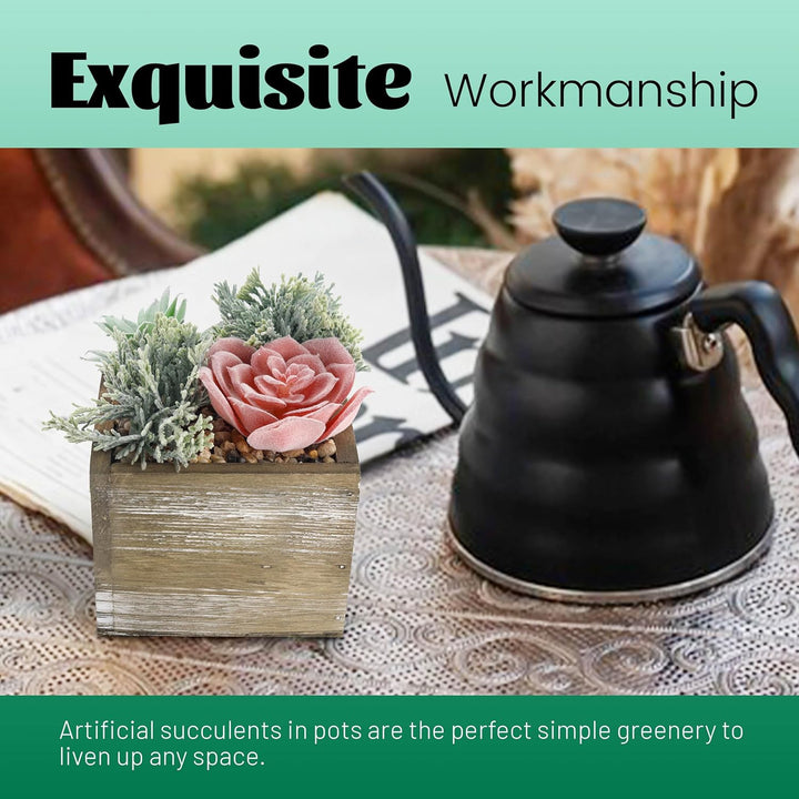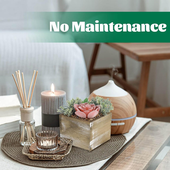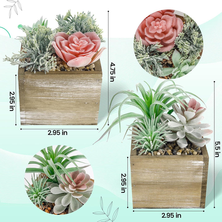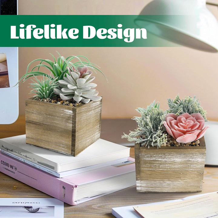 Miracliy 2 Pack Fake Plants Succulents Plants Artificial Plants in Wood Pots with Pink Flowers for Farmhouse Bathroom Decor